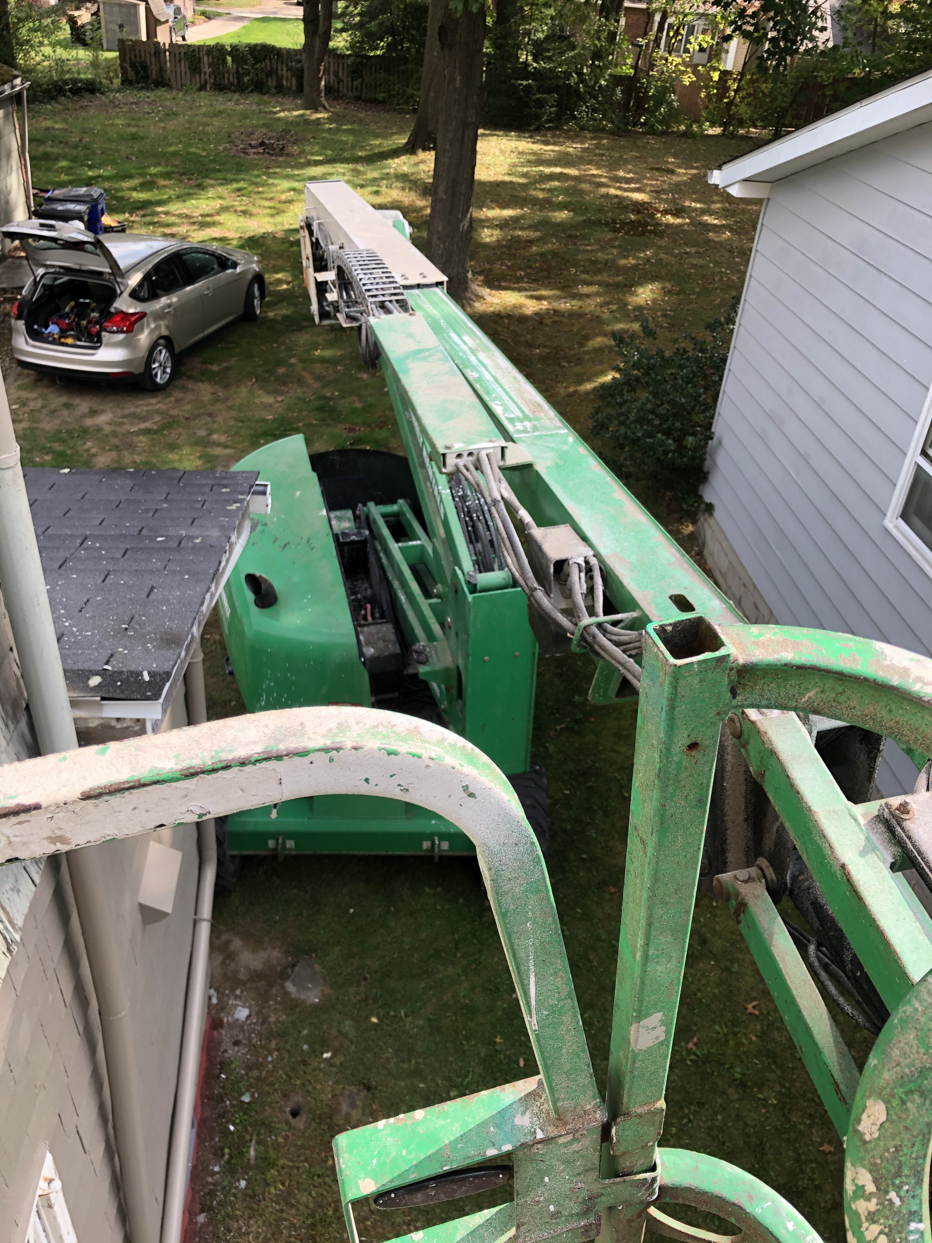 not enough clearance to get the machine down the side of the house, so the 50ft boom was stretched up and out every inch of reach to get to peak.