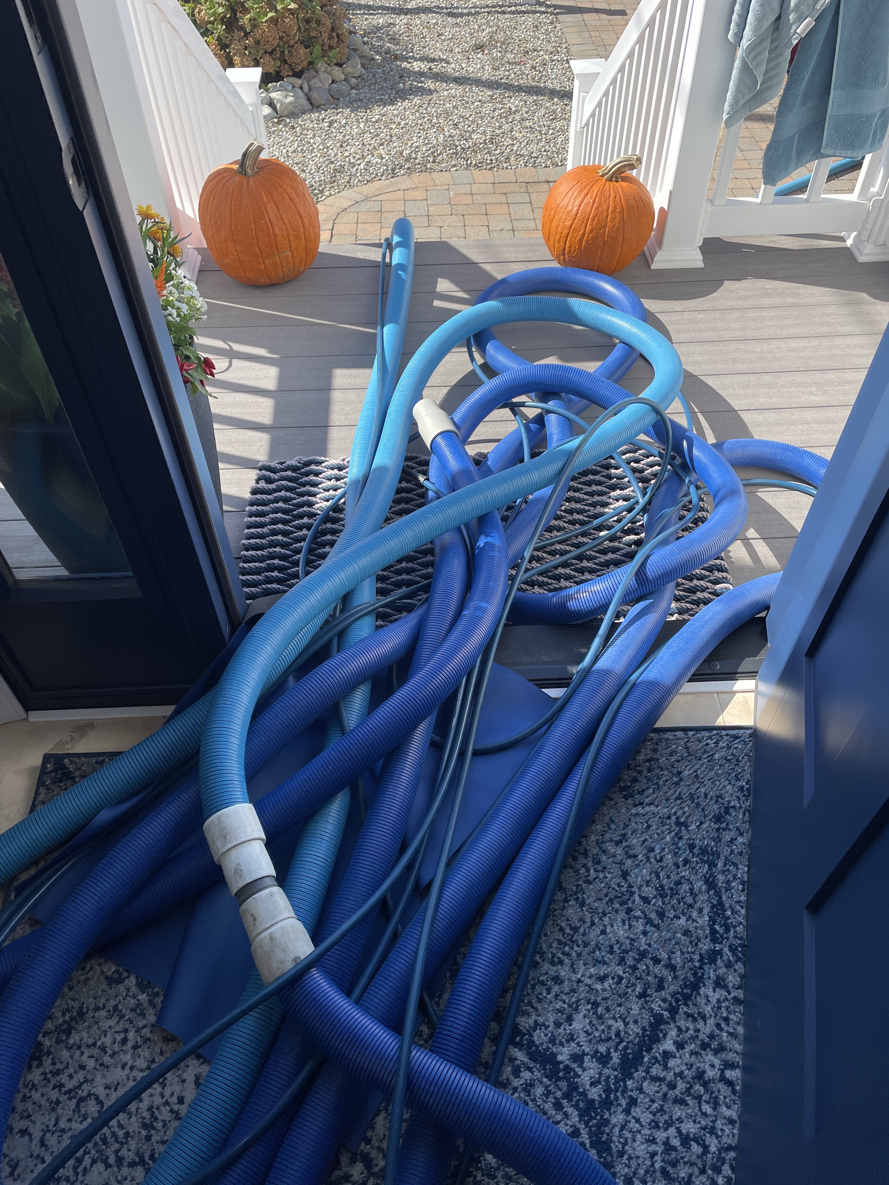 Looks like a mess, but this house was entirely freshly painted. The work was up at the top going up 4 sets of 6 stairs. I actually gathered the hoses in one shot of figure 8's as I walked them down to get to the point of the picture. Now, if I moved the Pumpkins ahead of time I could have walked right by the door without breaking stride. Just thought it was a good pic, and wanted to see if I could do it without knocking the pumpkin down. Practice for Christmas.
