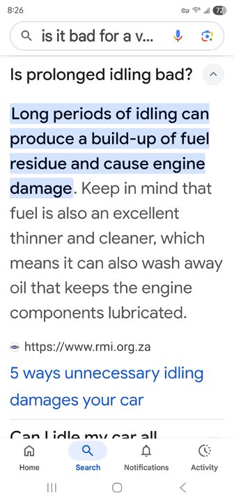 Well apparently google says prolong idle can cause damage. But i haven't experienced any so i will continue but if you ask google " does prolonged idling of modern engines cause damage" theres some good reading there .as for me its still business as usual. I think starting and stopping causes more harm than left runningYou know i keep hearing that idleing wearing out engines but emergency vehicles like ambulances fire trucks forestry trucks and police vehicles all idle for long periods????? All my pto's idle for long periods . Unless im fueling or in a store or something i generally start um in the morning and shut um down when i get home . my old 93 ford has 246k and 11k hours on the machine. My backup van has 216k and 10,563 on the machine. So i call BS on that theory as for putting a larger alternator on your van i say ,why??? An alternator only puts out power needed so if you only need 10a to keep your system topped off thats all your alternator will provide regardless of its capabilities. Newer vans like mine its a 2020 it has a circuit that cuts the alternator off till the charge runs down then activates to charge for awhile. Took some time getting use to seeing tha volt meter fluctuate that much .