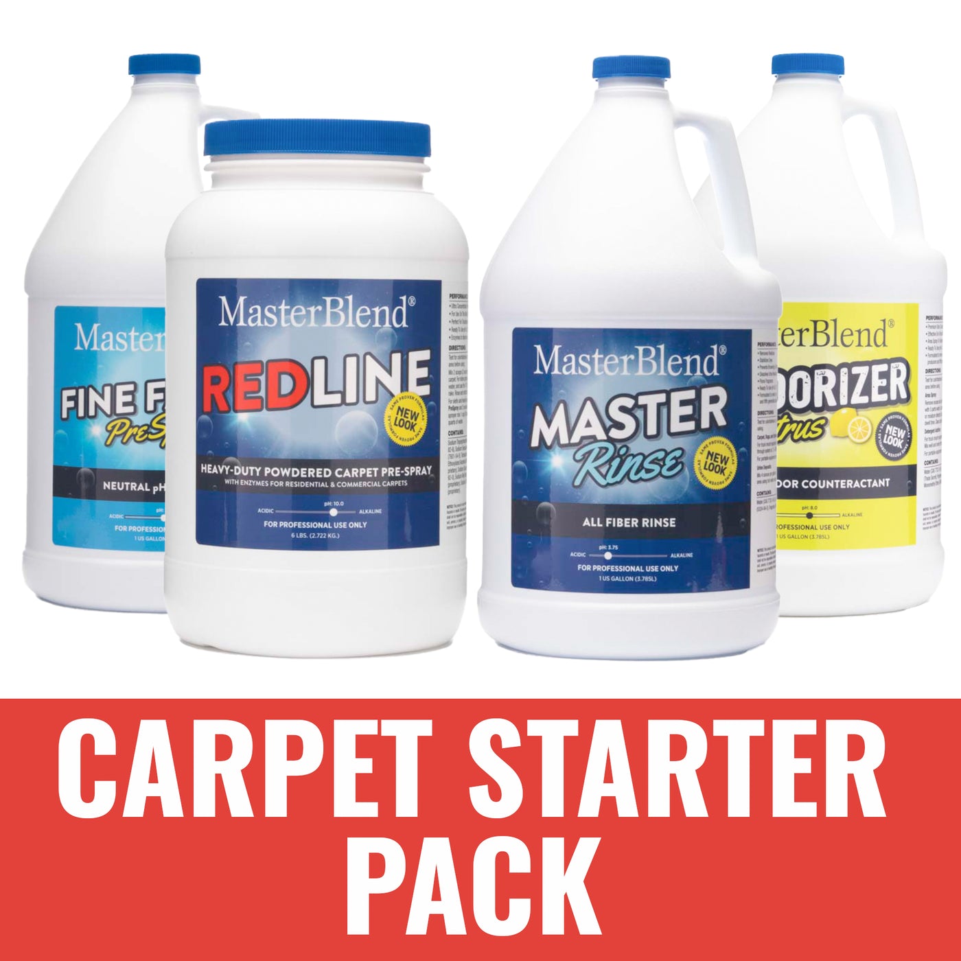 • One Carpet Starter Red Pack (1-gallon each of Fine Fabric PreSpray, MasterRinse, Citrus Deodorizer, and a 6-pound jar of RedLine PreSpray.)