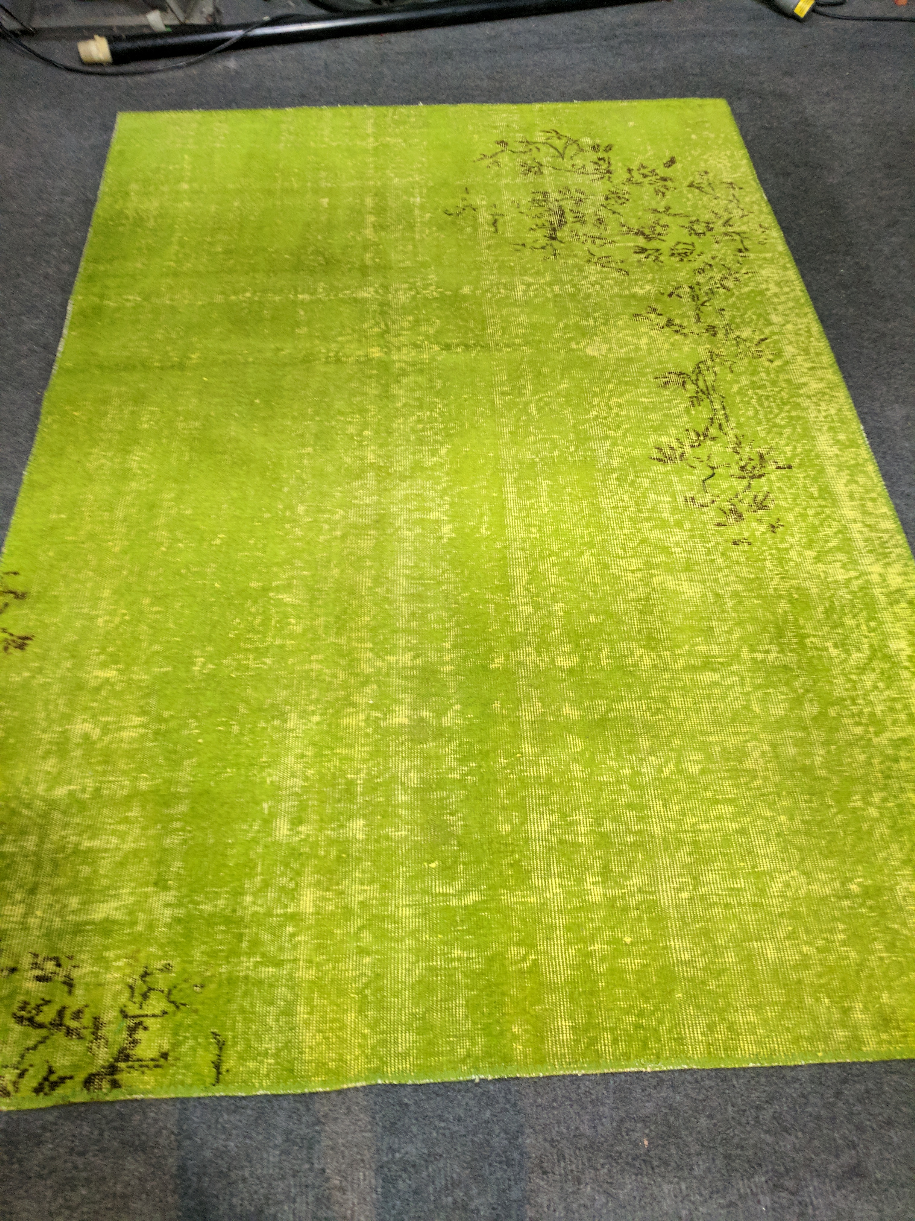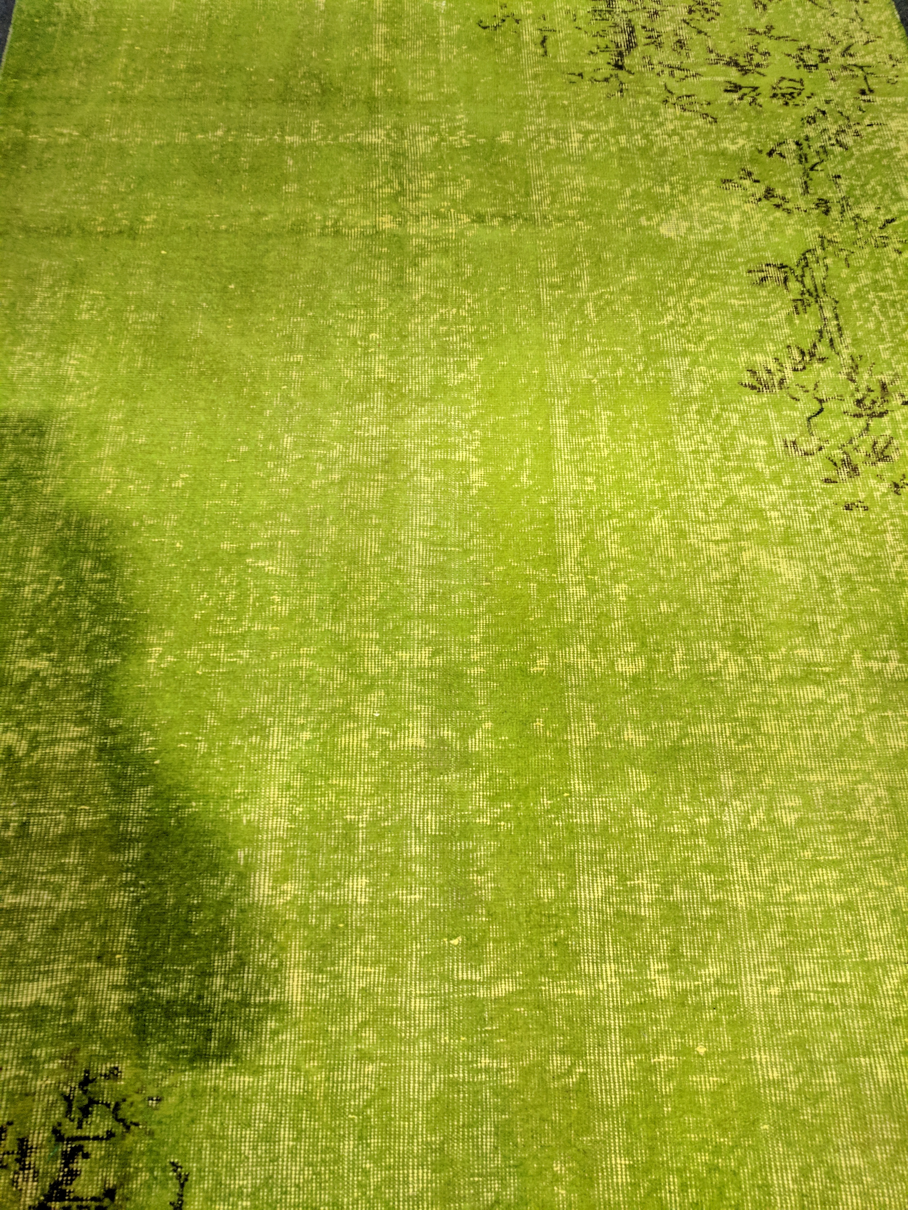 Here is a brand new rug designed to look like it is badly worn. At first glance, it looks like the backing is showing through but it is just color. What's next? Presoiled rugs?