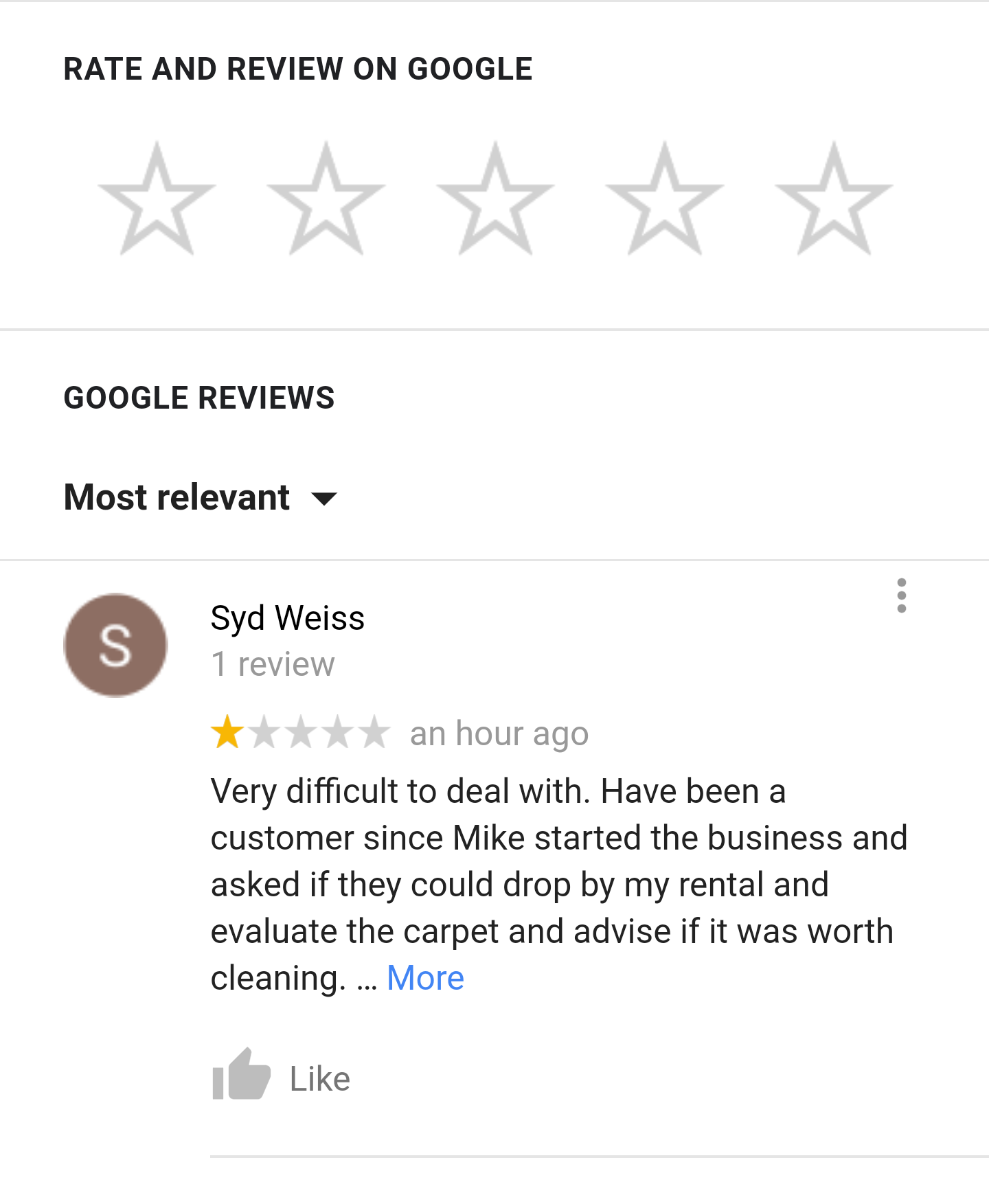As my daughter discussed with you, we are not in the Scotts Valley area on a date that would work for you. Due to the cost of running a real business in Santa Cruz county, it would cost us at bare minimum $100, to send an employee out to take a look and tell you if your carpet is cleanable or not.